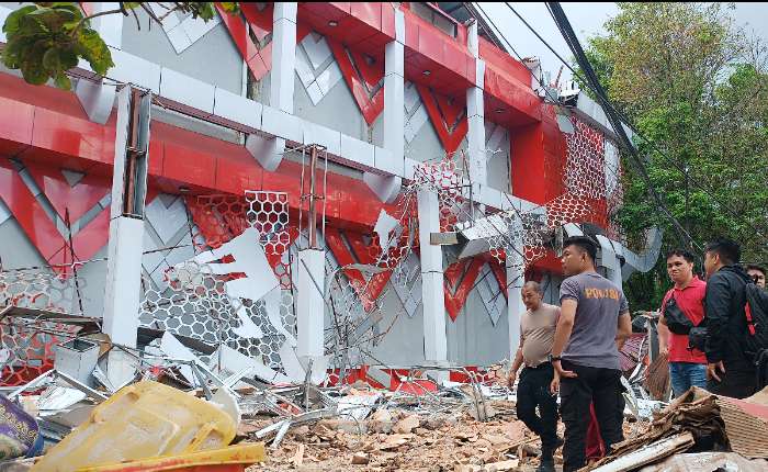 图为4月2日(周四),北苏拉威西省马纳多市,工作人员查看在7.6级地震中受损的Sario KONI大楼。该大楼受损严重,并造成1人死亡。此次地震于印尼东部时间(WIT)6时48分发生,震源深度18公里,震中位于北苏拉威西与北马鲁古交界海域比通附近。