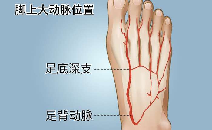 搭一搭。用手搭一搭足背动脉和胫后动脉(如图),动脉狭窄闭塞的一侧,搏动会减弱或消失。