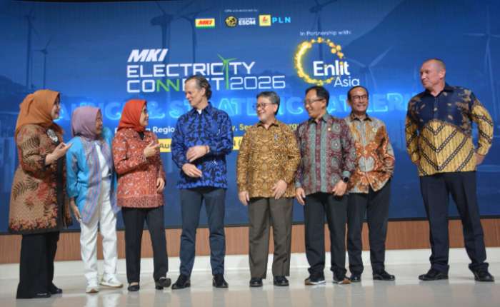 从左至右:2026年电力连接大会副主席诺埃西塔·英德里亚尼(Noesita Indriani)、印尼国家电力公司工程公司首席执行官查埃拉尼·拉赫马图拉(Chaerani Rahmatullah)、印尼国家能源委员会成员斯里佩尼·英腾(Sripeni Inten)、克拉里昂会展亚洲首席执行官理查德·爱尔兰(Richard Ireland)、印尼能源与矿产资源部电力总局秘书万哈尔·阿卜杜拉希姆(Wanhar Abdurrahim)、印尼国家电力公司零售与商务总监阿迪·普里扬托(Adi Priyanto)、印尼国家能源委员会成员萨蒂亚·尤达(Satya Yudha)、克拉里昂会展亚洲能源业务组合总监西蒙·霍尔(Simon Hoare)在现场进行交流。(商报 Hermawan摄)